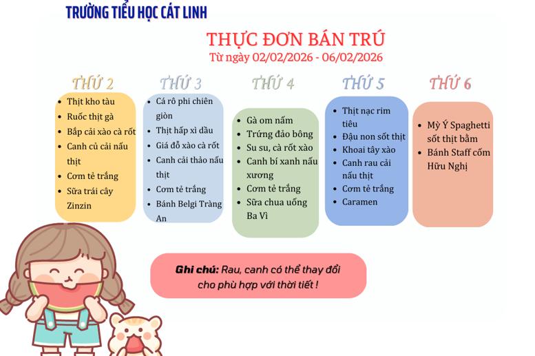 THỰC ĐƠN ĂN TRƯA TRƯỜNG TIỂU HỌC CÁT LINH TUẦN 1-2 THÁNG 5/2023