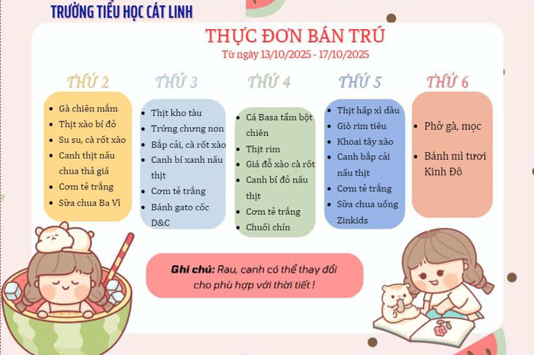 THỰC ĐƠN ĂN TRƯA TRƯỜNG TIỂU HỌC CÁT LINH TUẦN 5 THÁNG 3/2023