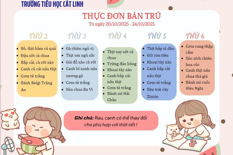 THỰC ĐƠN ĂN TRƯA TRƯỜNG TIỂU HỌC CÁT LINH TUẦN 4 THÁNG 3/2023