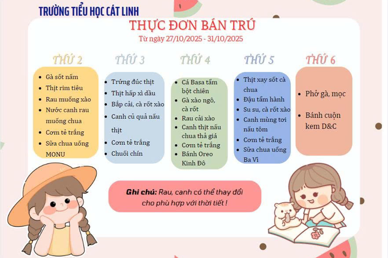 THỰC ĐƠN ĂN TRƯA TRƯỜNG TIỂU HỌC CÁT LINH TUẦN 5 THÁNG 3/2023 TỪ NGÀY 27/3-31/3/2023