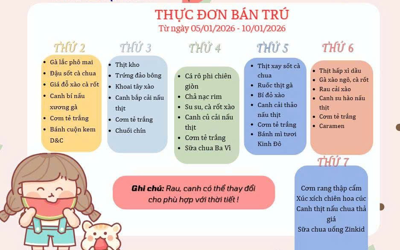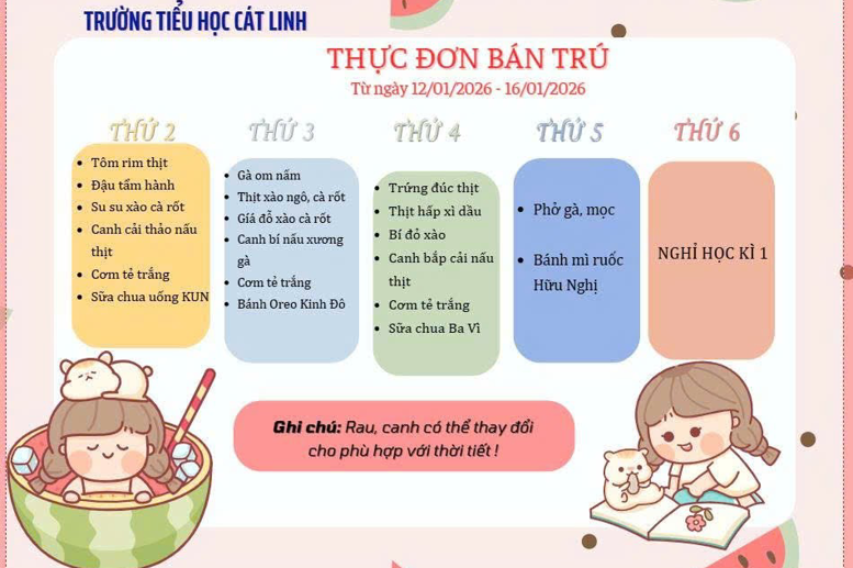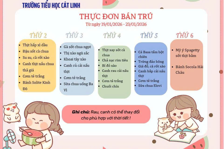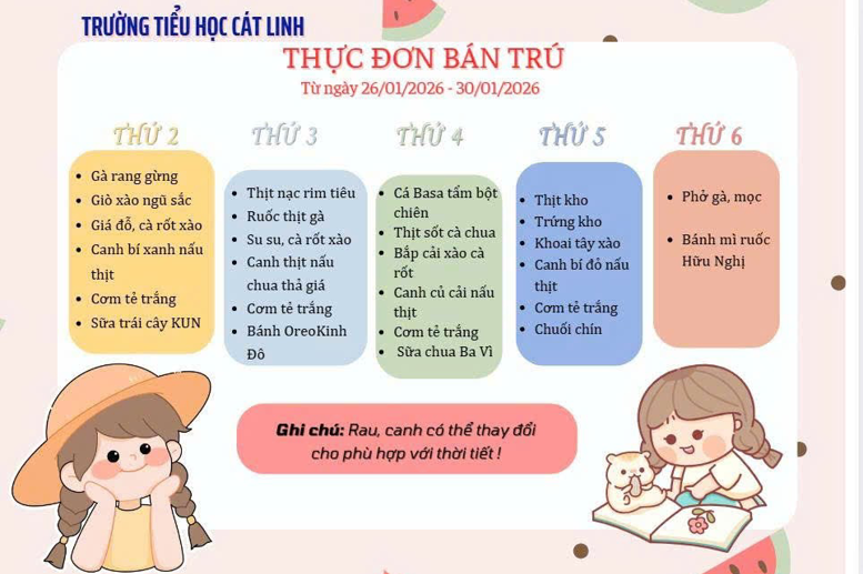 THỰC ĐƠN ĂN TRƯA TRƯỜNG TIỂU HỌC CÁT LINH TUẦN 1-2 THÁNG 5/2023