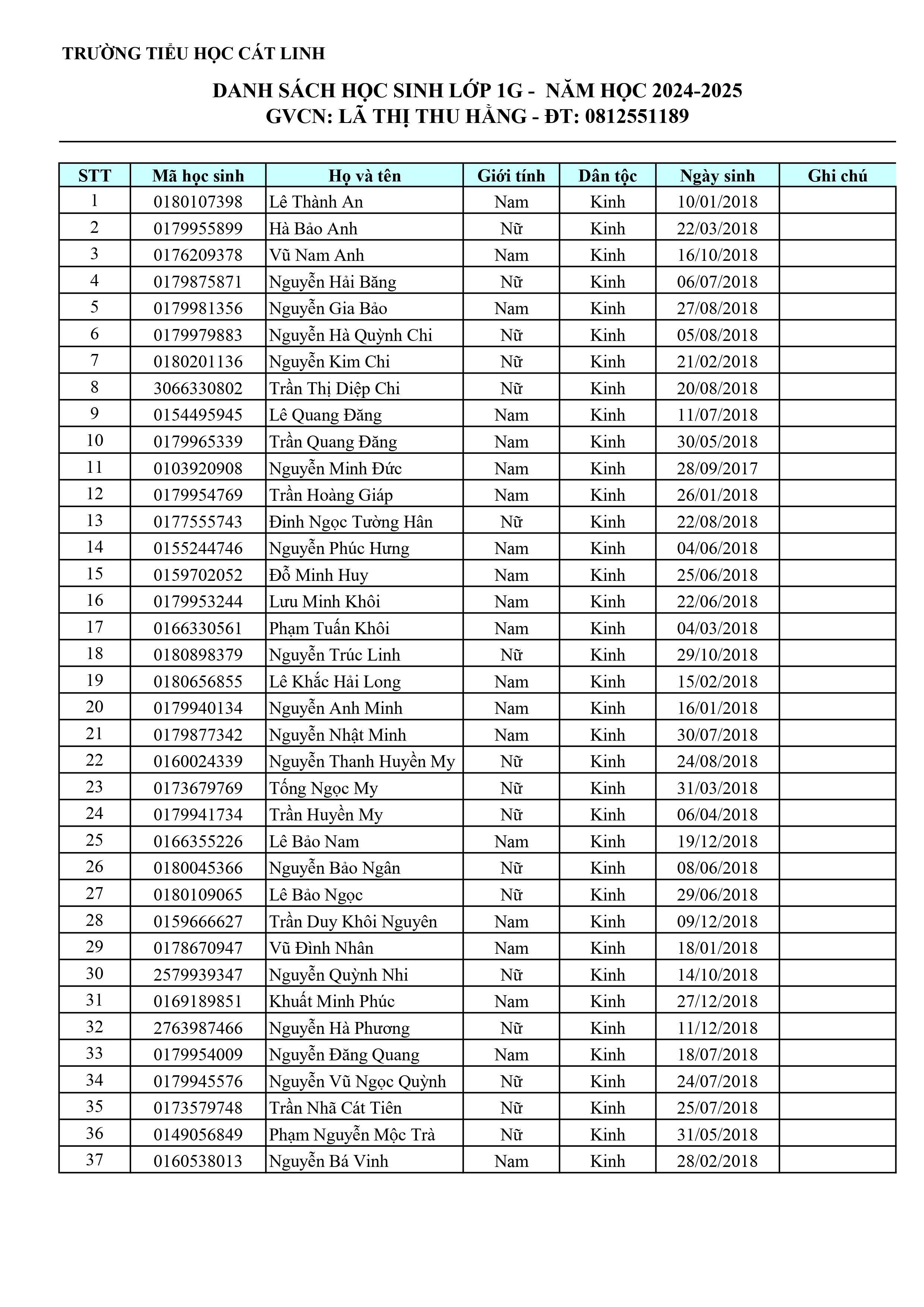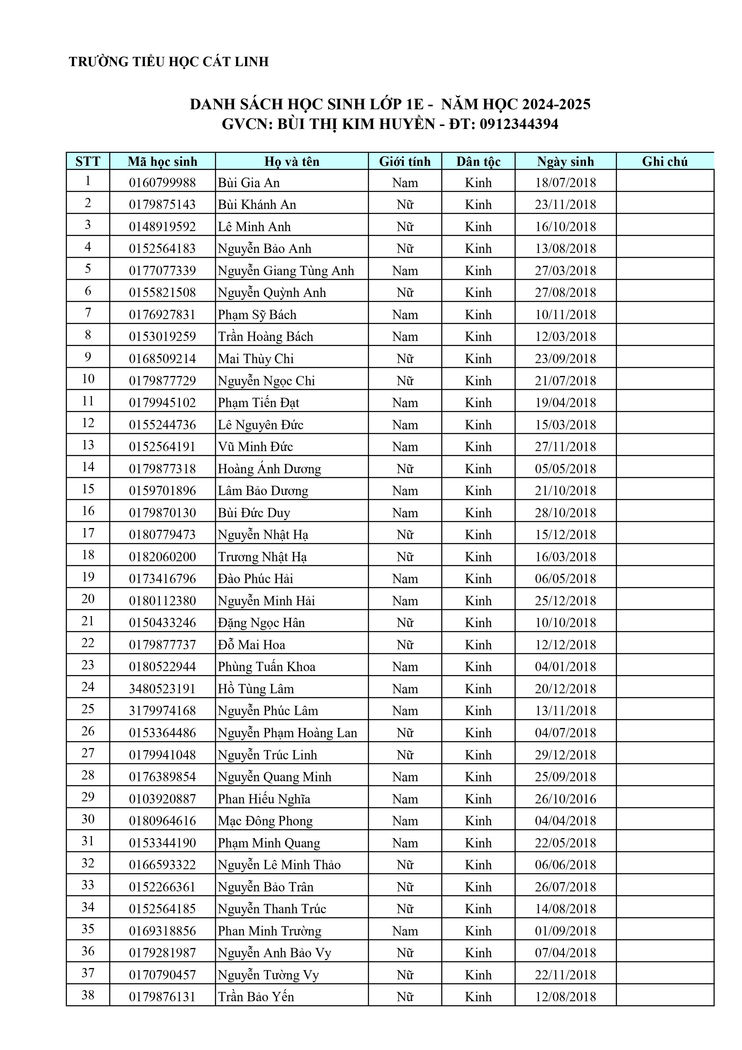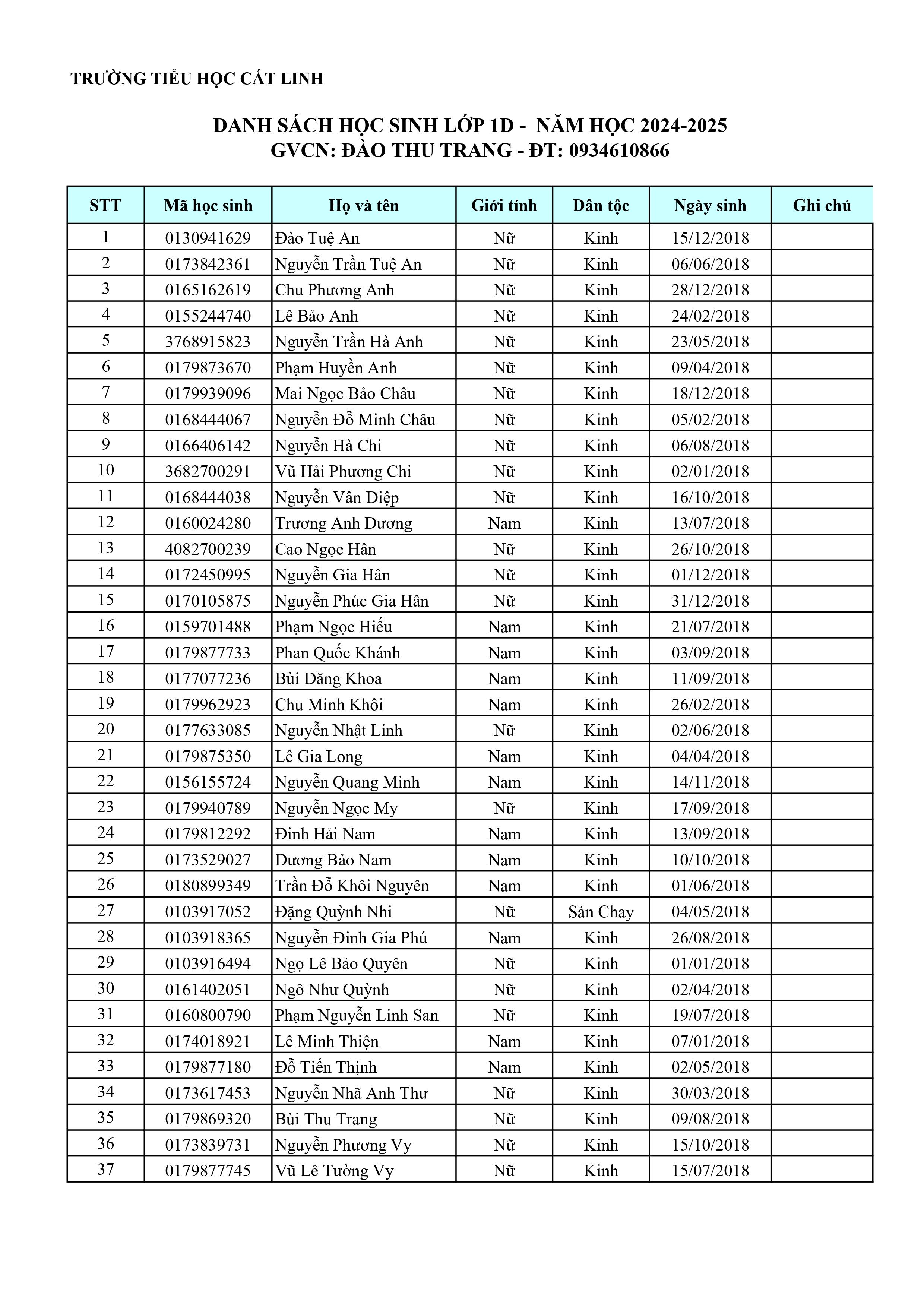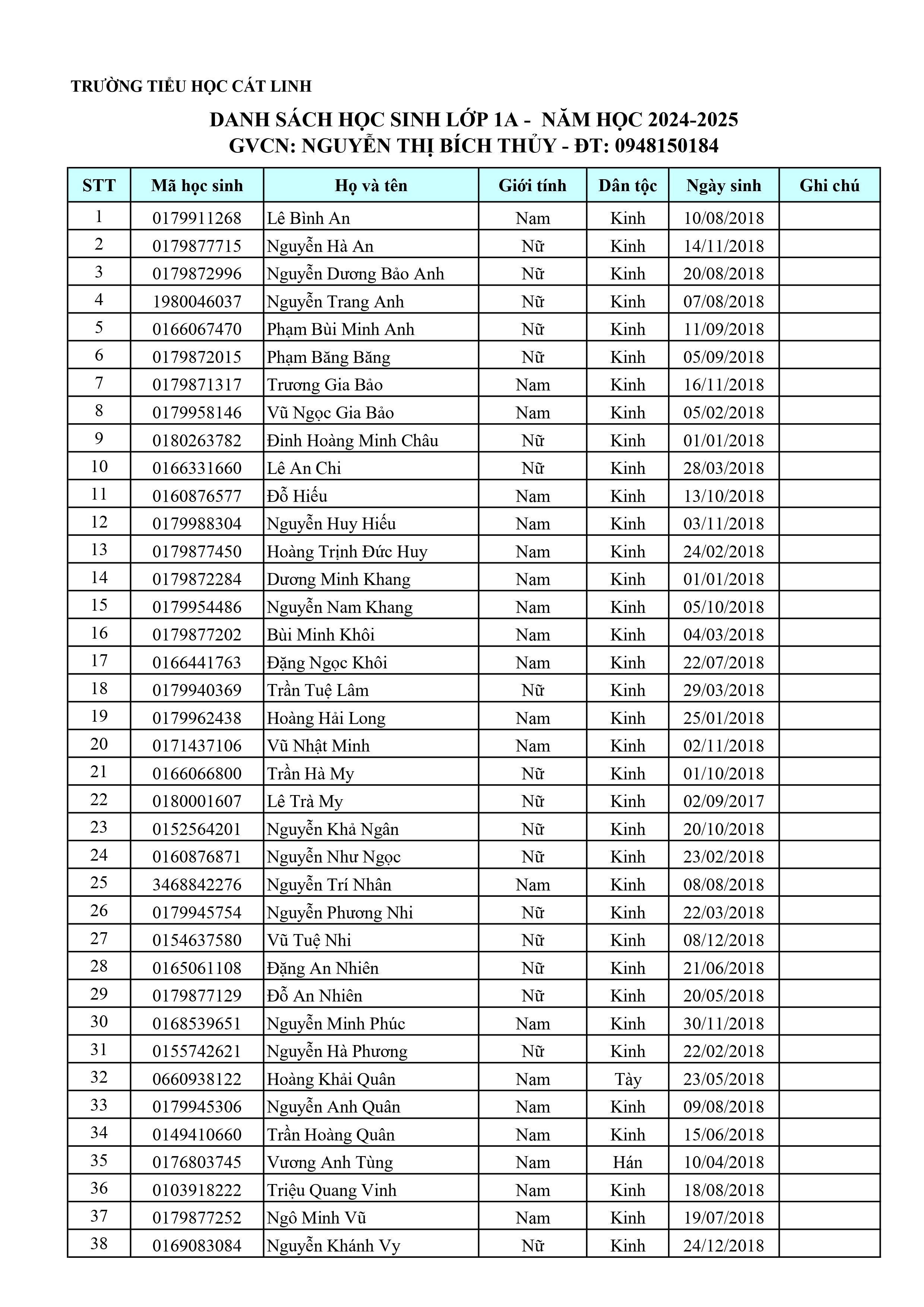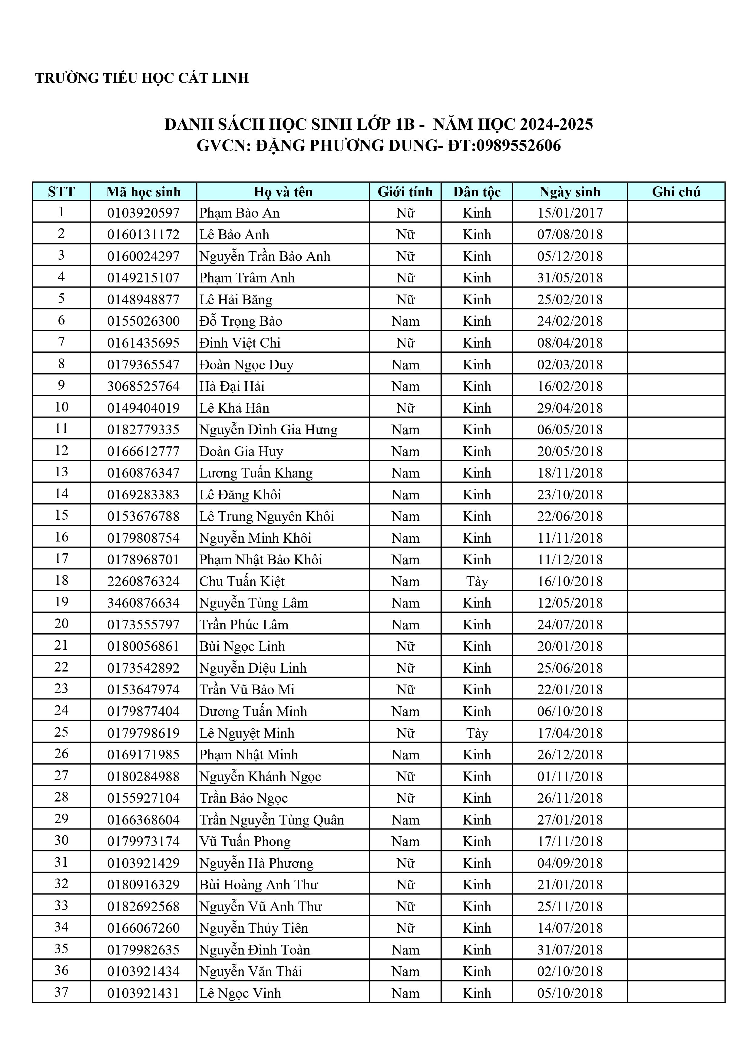 Trường Tiểu học Cát Linh trân trọng thông báo danh sách học sinh lớp 1 năm học 2024-2025