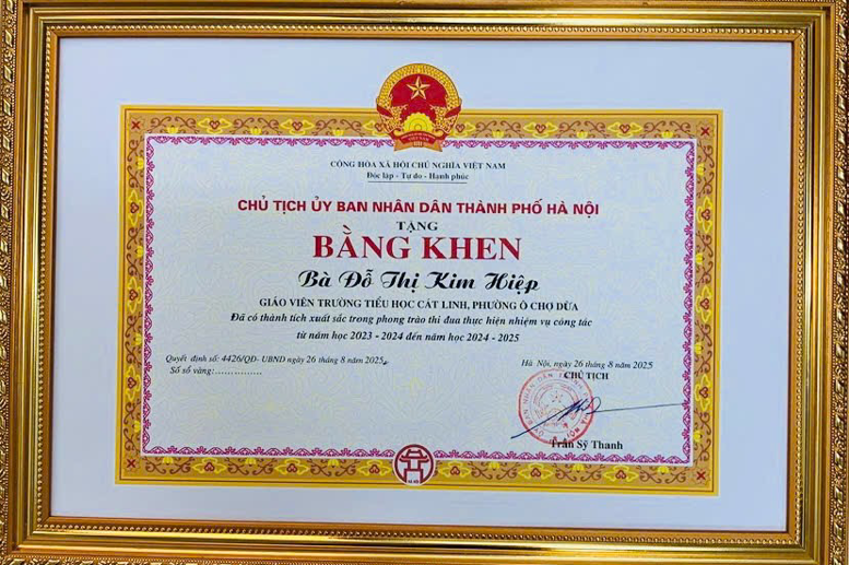 -Cô giáo Đỗ Thị Kim Hiệp được nhận Bằng khen "Đã có thành tích xuất sắc trong phong trào thi đua thực hiện nhiệm vụ công tác từ năm học 2023 - 2024 đến năm học 2024 - 2025" của Chủ tịch UBND Thành phố Hà Nội trao tặng.